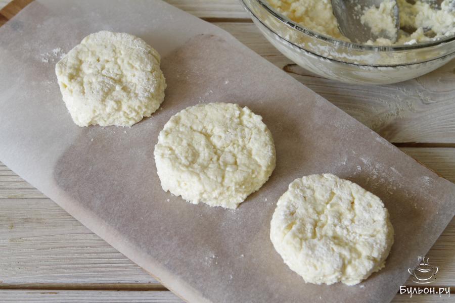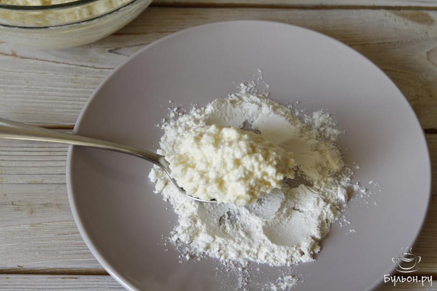 5. Из этого количества ингредиентов получится 6 сырников. На тарелку или рабочую поверхность высыпать муку, столовой ложкой набрать творожную массу и выложить ее на муку.
