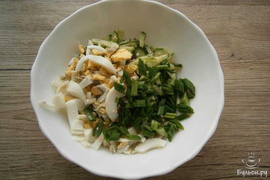 2. Яйца, предварительно сваренные вкрутую, порезать длинными кусочками, добавить в салат порезанный перьями зеленый лук.