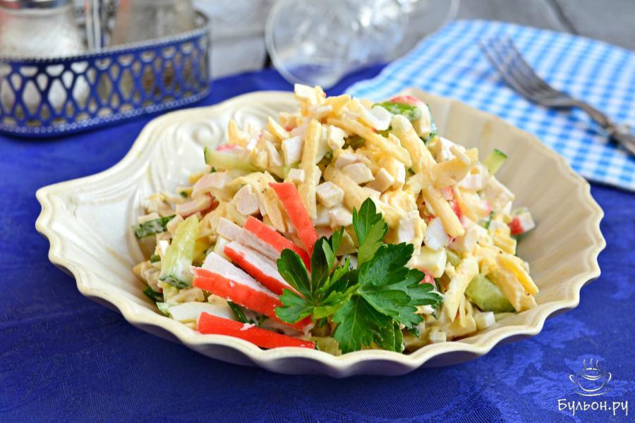 1. Крабовые палочки или крабовое мясо порезать не крупно, добавить порезанный соломкой или тонкими брусочками свежий огурец.