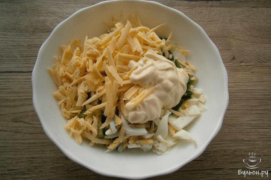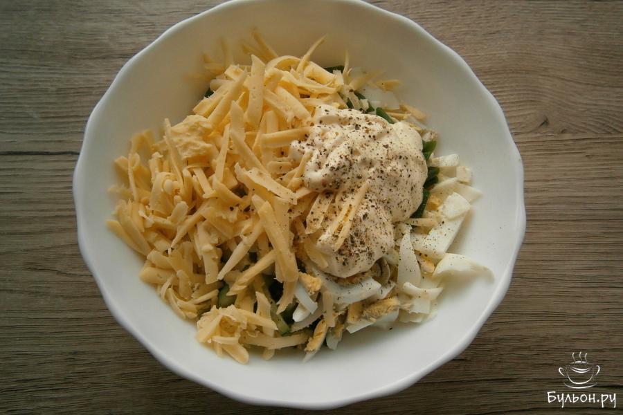 3. Сюда же, натереть сыр твердых сортов, для чего использовать крупную терку и добавить нежирный майонез.