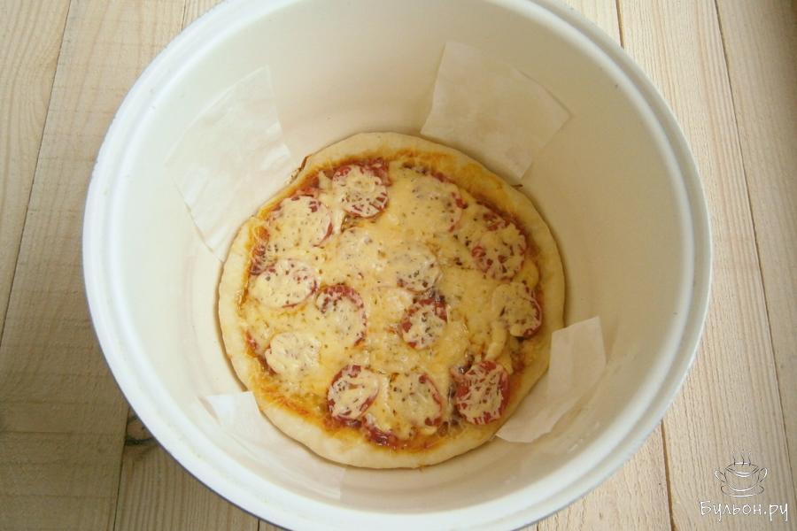 9. Готовую пиццу извлечь из чаши с помощью пергаментных полосок, украсить петрушкой, подать горячей. Таким же образом испечь вторую пиццу из оставшегося теста. Приятного аппетита.