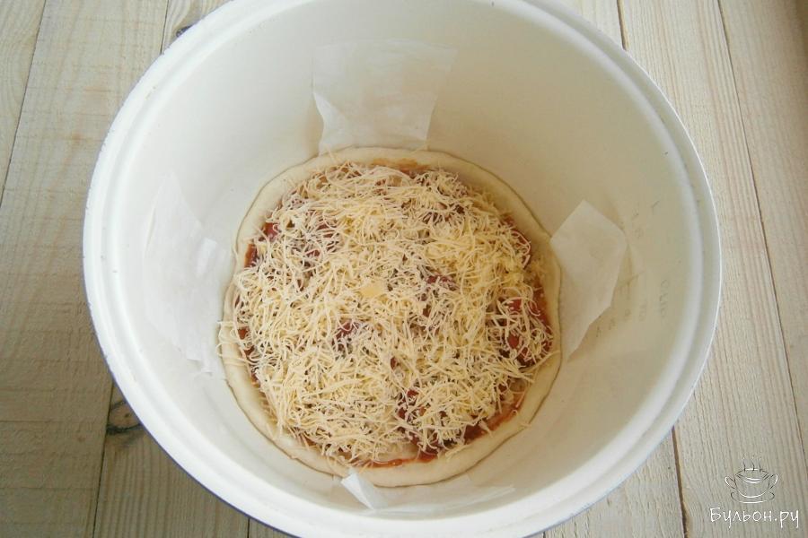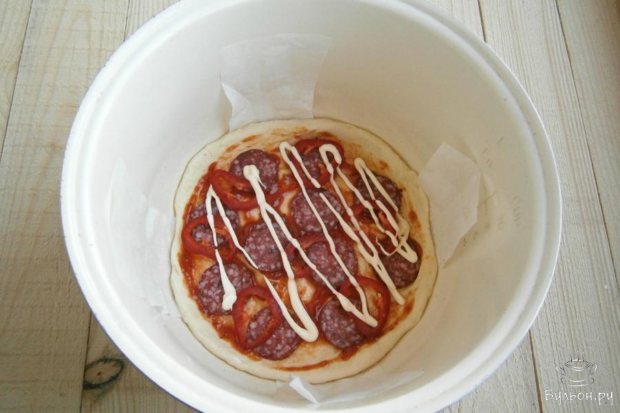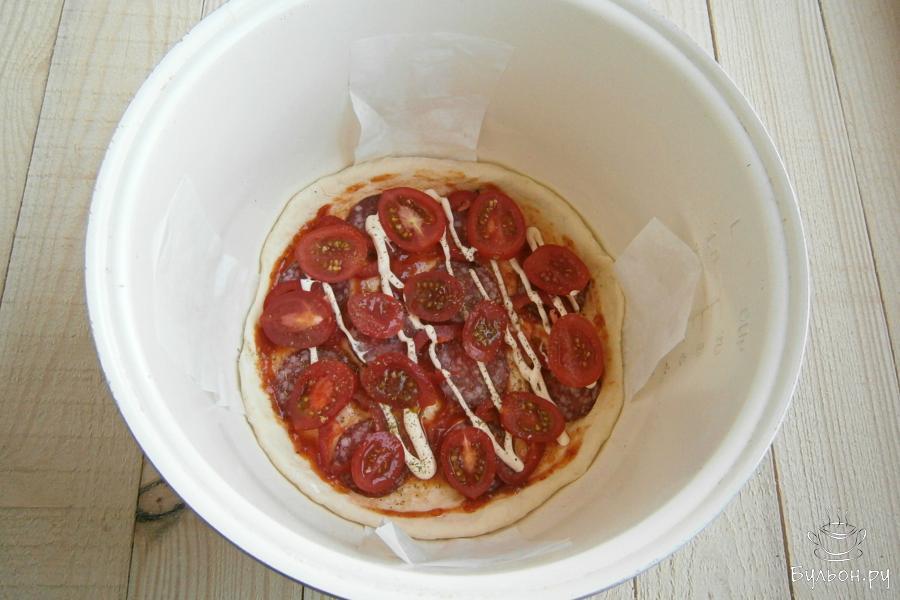 4. Каждую часть раскатать по диаметру чаши из мультиварки в лепешку, поместить ее в чашу, которую смазать чуть растительным маслом. Чтобы легко было извлечь готовую пиццу, разместите под лепешкой крест-накрест полоски из пергамента. Лепешку смазать кетчупом или любым томатным соусом.