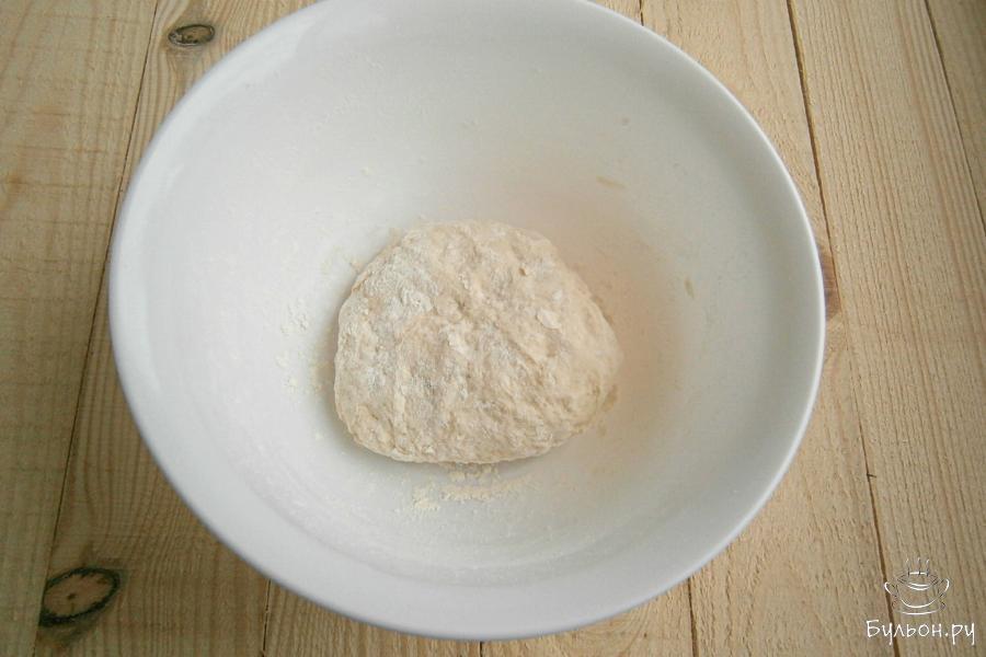 3. Замесить довольно плотное, но достаточно и мягкое тесто, которое прикрыть полотенечком и оставить в тепле для подхода на один час. Далее, тесто обмять и разделить его на две равные части.