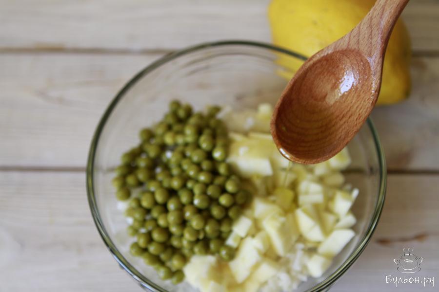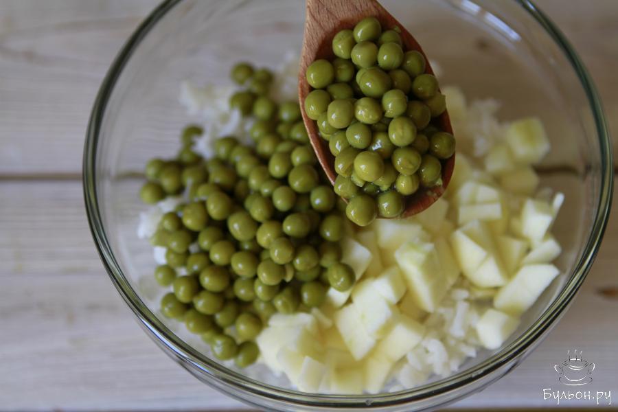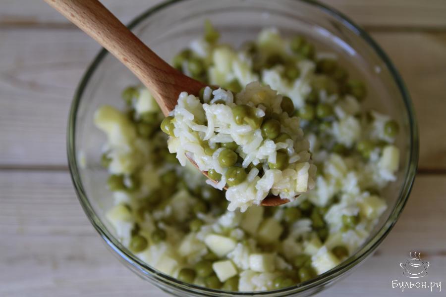 5. Все ингредиенты хорошо перемешать между собой. Вкусный салат с рисом и зеленым горошком готов, и его можно подавать к столу. Приятного Вам аппетита.