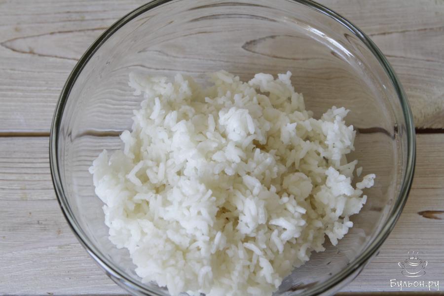 1. Отварить рис. Как вариант приготовления: на сливочном масле обжарить рис не более одной минуты, влить воду, довести ее до кипения, посолить. Вода должна полностью выпариться, затем убавить огонь и закрыть крышкой кастрюлю. Оставить кастрюлю на плите еще на пару минут.