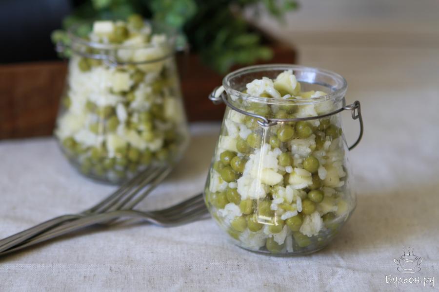 Рисовый салат с яблоком и зеленым горошком уникален во всех планах. Его можно подать как самостоятельное блюдо, а если вас не смутит в нем присутствие яблок, то и на гарнир например к мясу. Салат получается вкусным и сытным. Зеленый горошек в салат можно добавить свежий или консервированный, или вовсе заменить на кукурузу. Рис приготовить можно заранее и удобным для вас способом. Попробуйте и оцените этот простой и интересный салат.