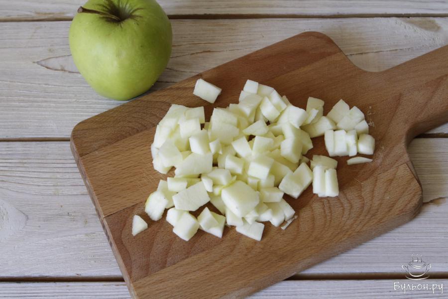 2. Яблоки для этого салата выбирайте на свой вкус. Одним нравятся сладкие, другим кисло-сладкие. Яблоки очистить от кожуры и нарезать на небольшие квадратики.