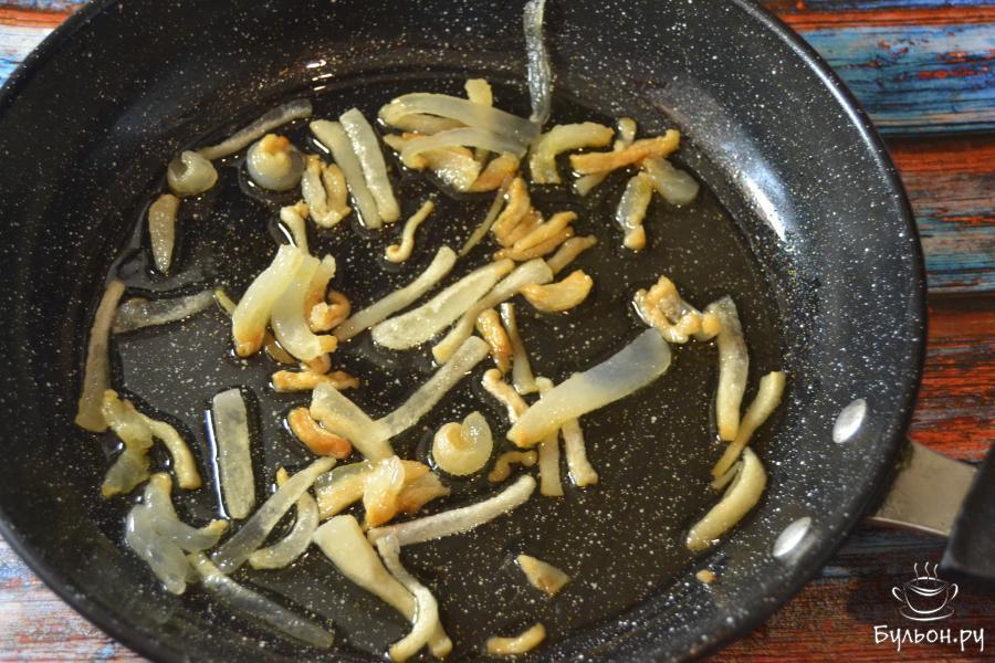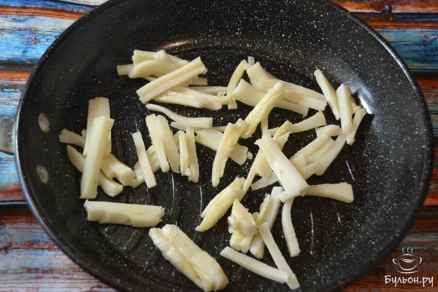 2. Сало нарежем тонкими ломтиками и растопим на сковороде. Вытопившегося жира нам должно хватить для жарки.