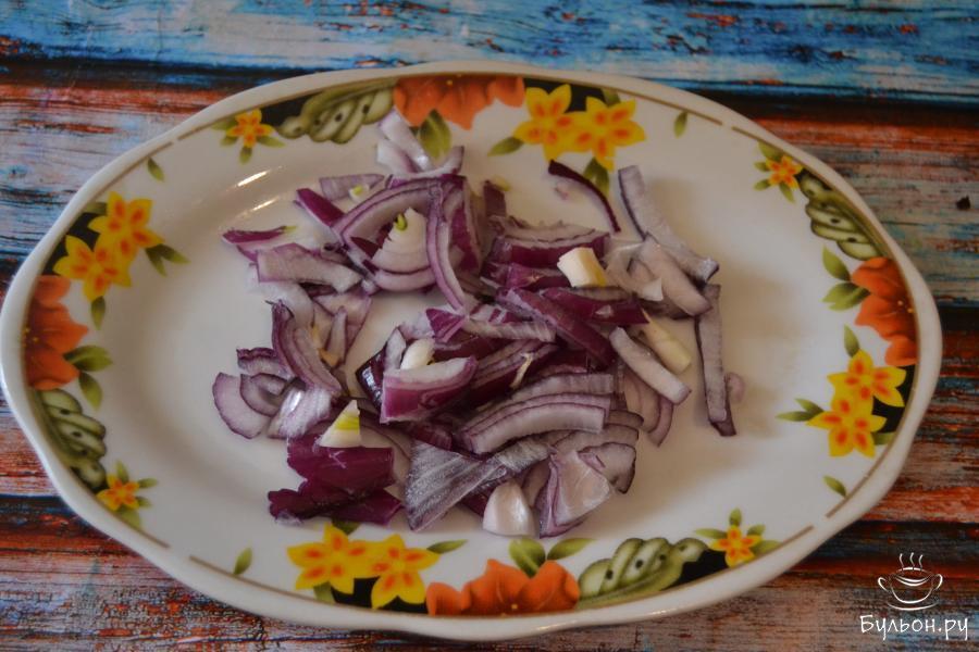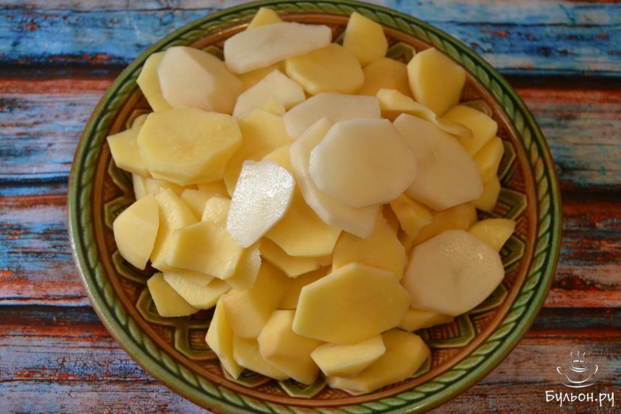 6. Картошку почищенную нарежем тонкими кружками. Можно и полукругами или соломкой - это не принципиально. Делайте так, как привыкли.