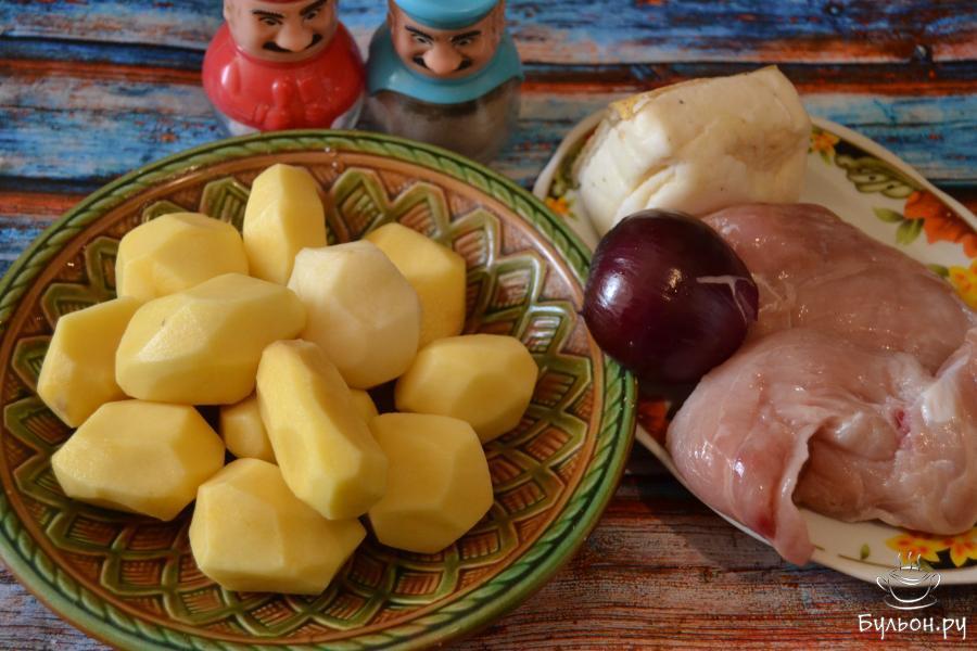 1. Подготовим продукты. Кроме сала мы поджарим еще и куриное филе: у нас получится полноценный ужин. Картошку начистим и вымоем.