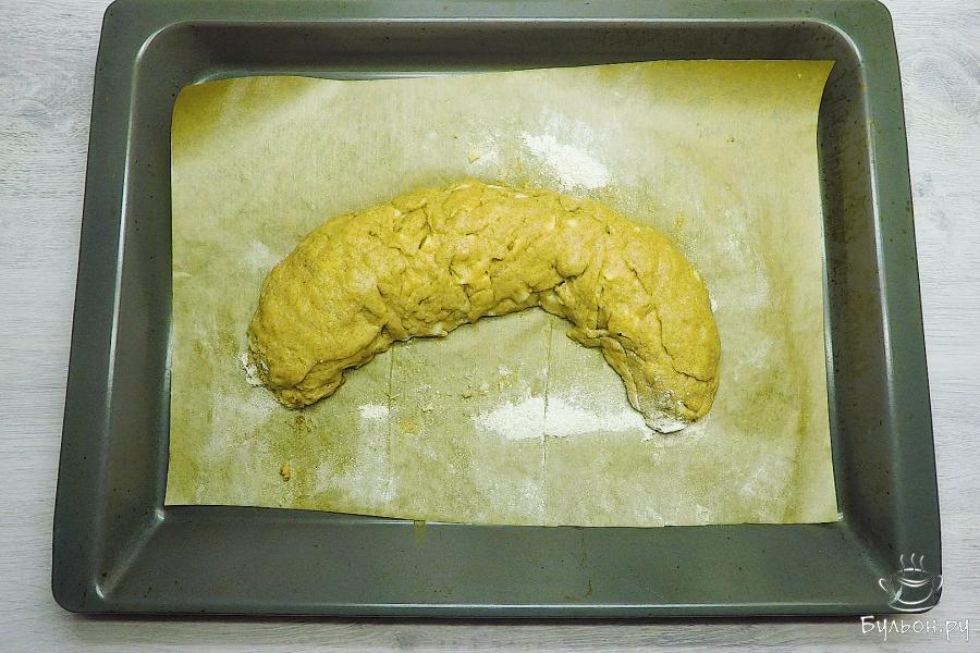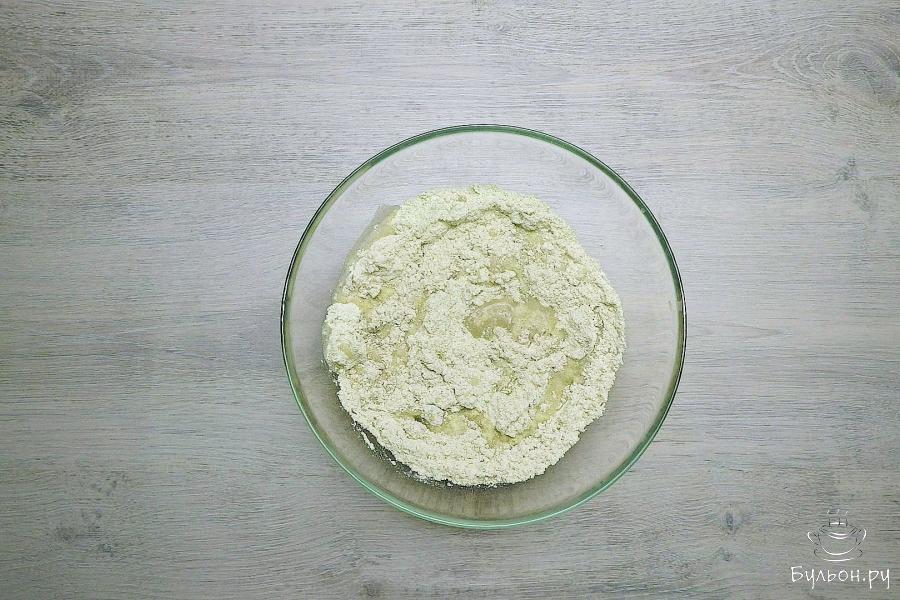 3. Замесить мягкое податливое тесто. Завернуть пищевой пленкой. Оставить отдыхать на 20-30 минут, пока будет готовиться начинка.
