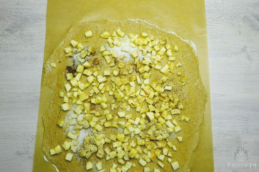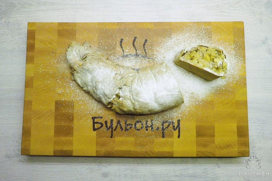 7. Штрудель аккуратно свернуть рулетом. Защипать концы. Переложить на противень, застеленный пергаментной бумагой.