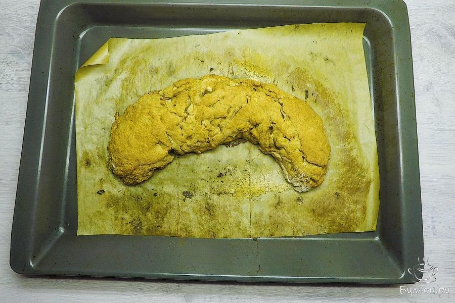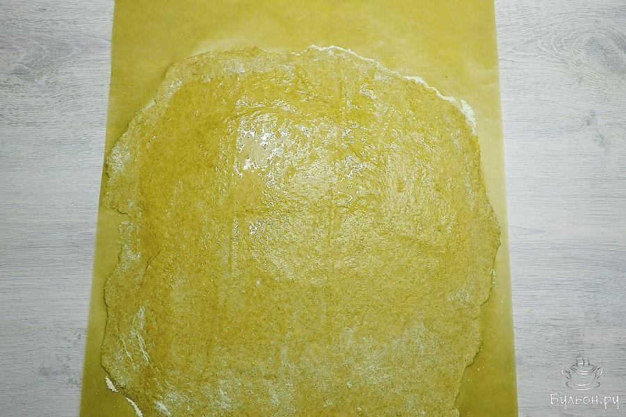 5. На хорошо присыпанной мукой поверхности раскатать тесто как можно тоньше. Смазать пласт растительным маслом.