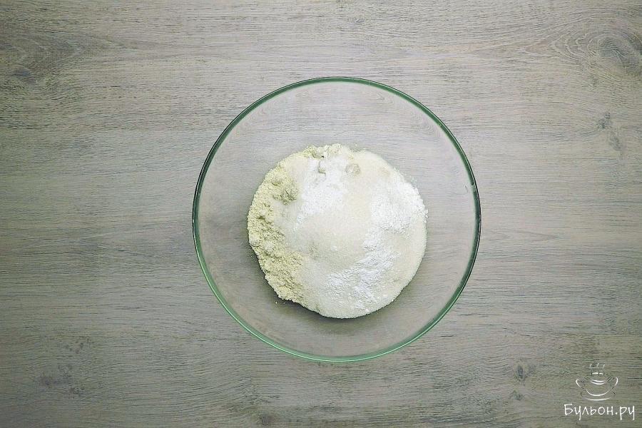 1. Смешать сухие ингредиенты: цельнозерновую муку, разрыхлитель, соль, 70 г сахара. По желанию, можно использовать коричневый сахар.