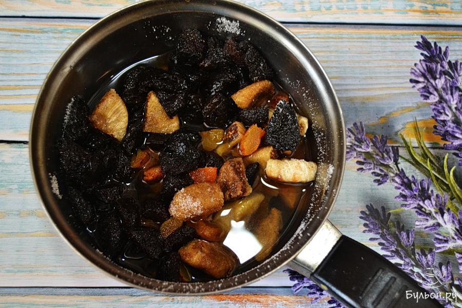 4. Нальем воду в количестве, чтобы быть вровень в сухофруктами. Добавим несколько гвоздичек и поставим вариться.