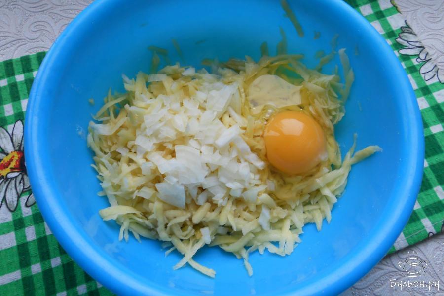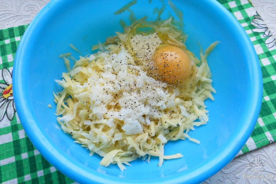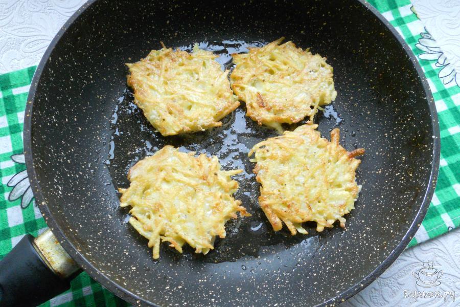 5. Сковороду разогреть с растительным маслом. Выкладывать картофельную массу ложкой в виде круглых, плоских оладий.