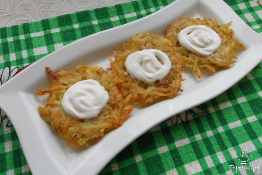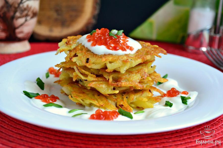 Картофельные оладьи с красной икрой и сметаной - замечательное праздничное блюдо, которое готовится и просто, и быстро. Оладьи из картофеля можно предложить и горячими, и охлажденными - в виде закуски. Очень вкусные картофельные оладьи в сочетании со сметаной и икрой - поистине царское блюдо, которое обязательно понравится вам и вашим близким.