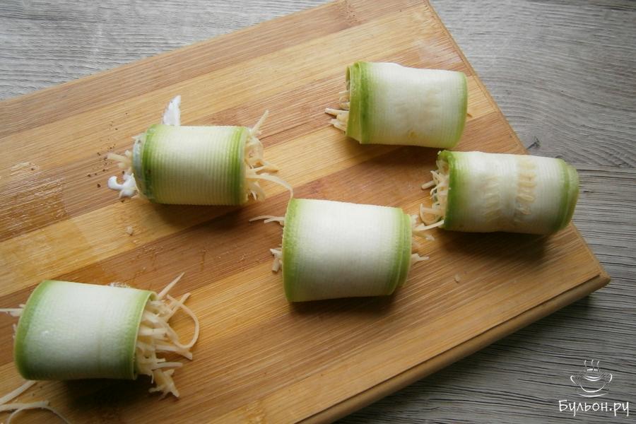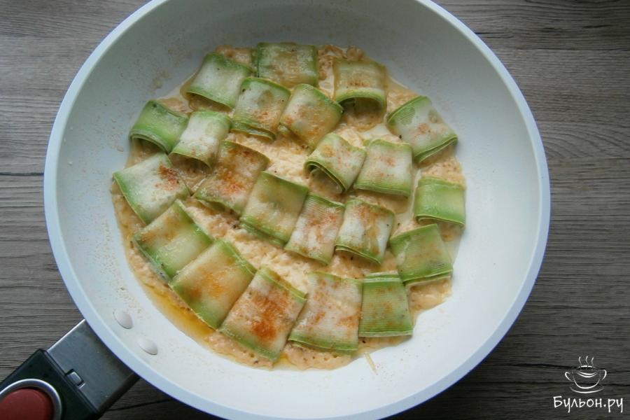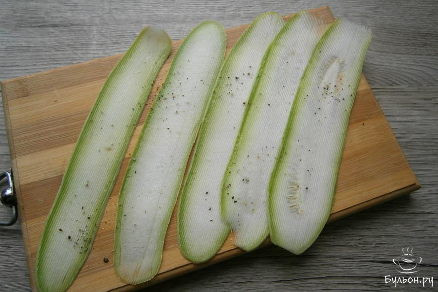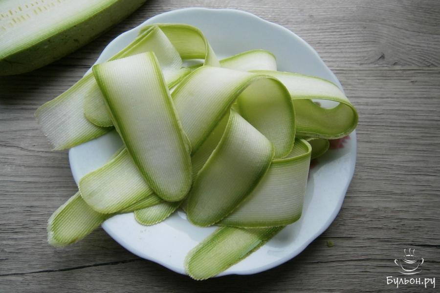 1. Молодой кабачок нарезать с помощью овощечистки на тоненькие слайсы. Середину с семенами оставить для другого блюда.