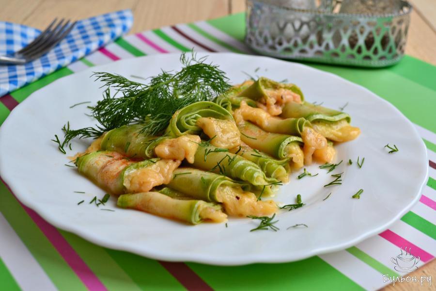 Обычно, рулетики из кабачков готовят в качестве холодной закуски, я хочу предложить вам интересный и необычный рецепт теплой закуски под таким же названием. Сыр заворачивается в тоненькие слайсы из кабачков, затем, рулетики чуть поджариваются и тушатся в небольшом количестве бульона буквально 5-7 минут. За это время сыр расплавляется внутри, часть его вытекает, обволакивая кабачки снаружи. Получается закуска очень вкусной, насыщенной и подать ее можно с любым острым соусом к отварному мясу или рыбе. Обязательно попробуйте, очень необычно, но безумно вкусно.