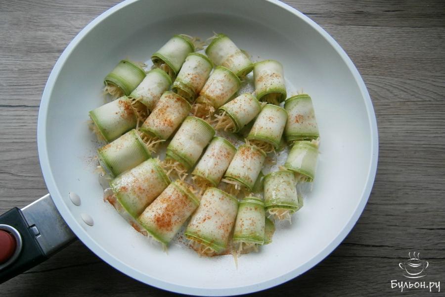 5. Сковороду смазать растительным маслом и выложить в нее все рулетики с сыром. Посыпать сверху паприкой. Поставить сковороду на средний огонь и поджарить рулетики в течение 3-4 мин.