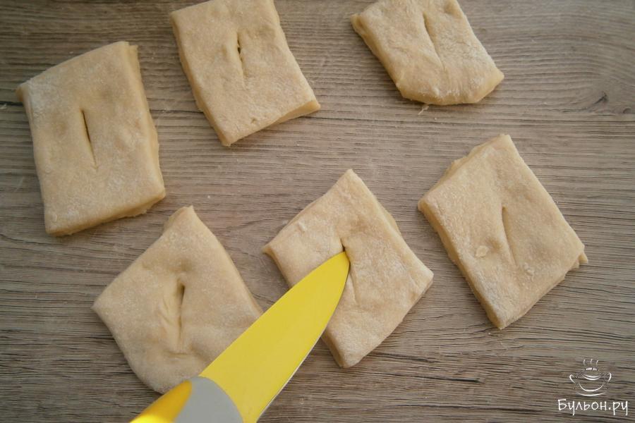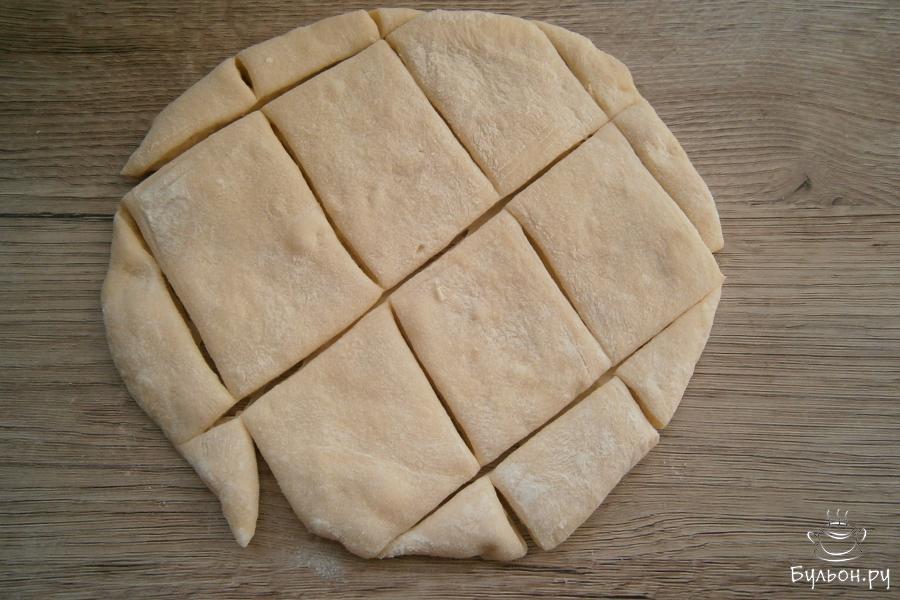 4. Далее, тесто чуть обмять, разделить его на части. Каждую часть раскатать в небольшую лепешку, толщина которой должна быть не менее 1 см. Тесто порезать средними ромбами.