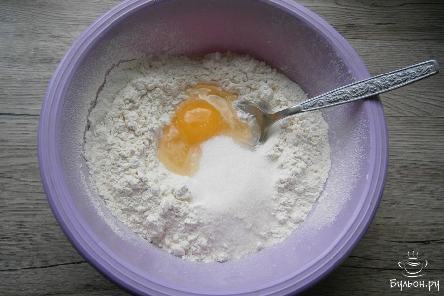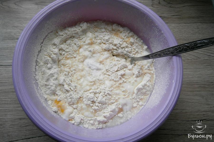 2. Добавить чайную ложку ванильного сахара, ложкой все смешать с частью муки, сделать углубление. Добавляя в муку кефир комнатной температуры, замесить тесто.