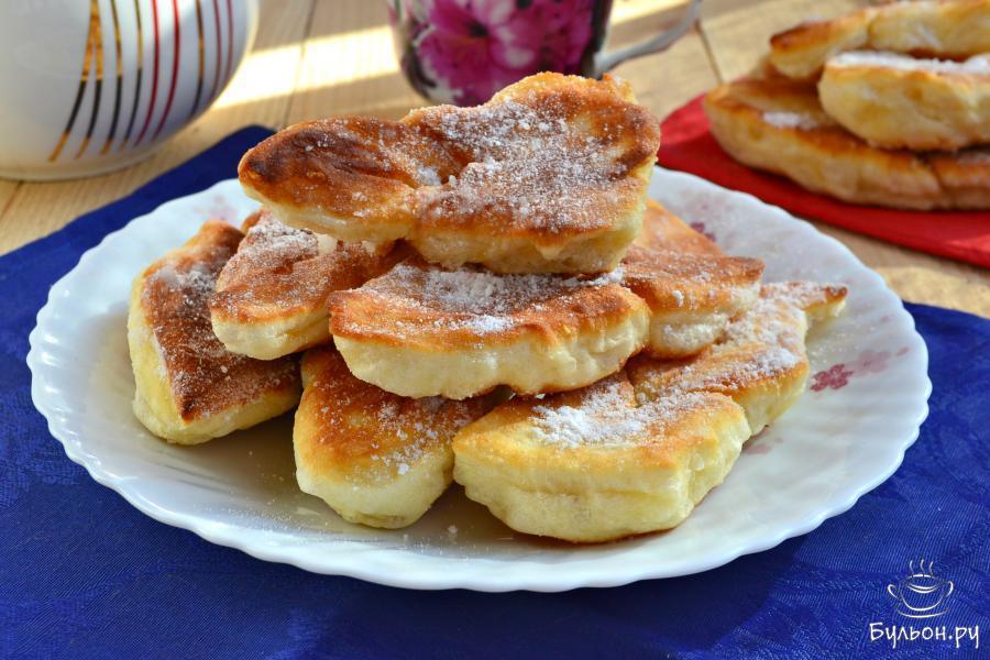 7. Вергуны жарятся довольно быстро, становятся очень пышными и воздушными. После жарки немного остывшие вергуны, по-желанию, посыпать пудрой сахарной, подав к ним еще и варенье, мед или сгущенку. Приятного аппетита.
