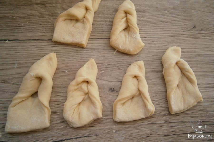6. И затем, верхнюю часть ромба вывернуть, пропустив ее через разрез, формируя вергуны. Сковороду разогреть с любым маслом растительным. Жарить вергуны в кипящем масле, на небольшом или среднем огне до румяного цвета с одной и с другой стороны.