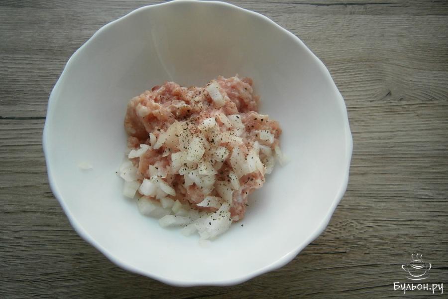 2. К фаршу добавить мелко порезанный лук репчатый, соль и немного, по-желанию, свежемолотого черного перца.