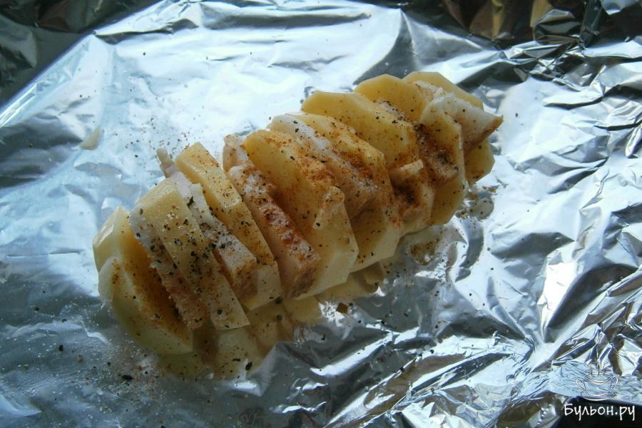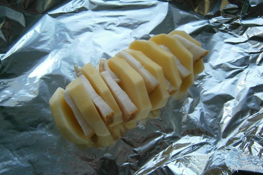 3. Приготовить 3 листа фольги, сложенные вдвое. На листе разместить одну порезанную картофелину, разместив между кружочками кусочки свежего сала. посолить.