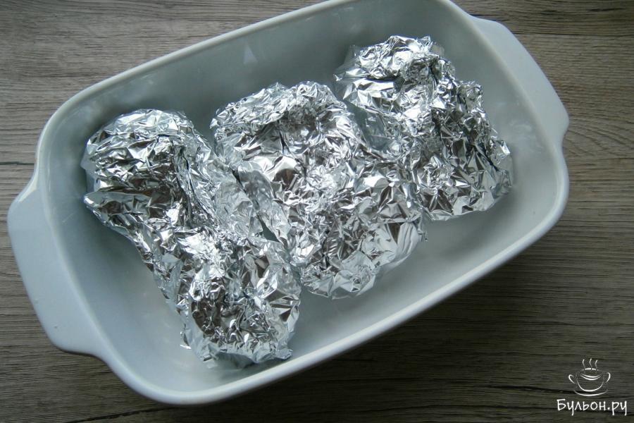 5. Края фольги плотно завернуть кверху. Также, подготовить оставшийся картофель. Сложить его в небольшую форму для запекания.