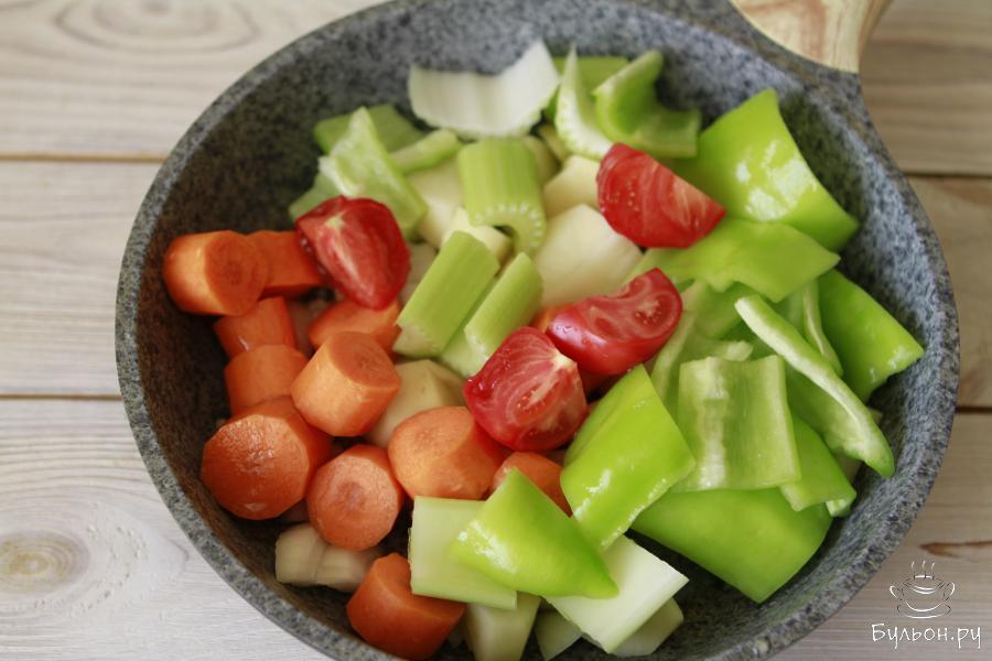 4. Подготовленные овощи переложить в кастрюлю или глубокую сковороду. Влить 2 столовые ложки растительного масла и воды. Закрыть крышкой и томить на среднем огне примерно 25-30 минут.