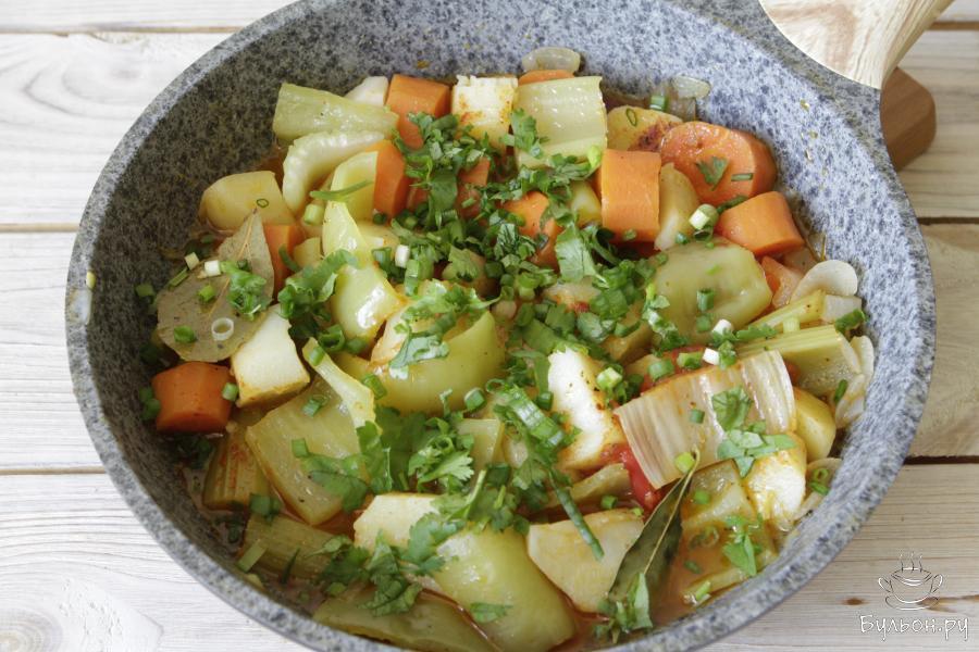 6. Готовое блюдо обязательно присыпать свежей зеленью и можно подавать к столу. Перед ароматом тушеных овощей устоять невозможно. Приятного Вам аппетита.