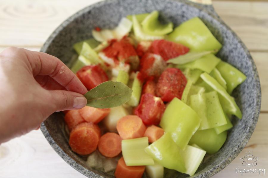 5. По истечении времени добавить специи, два зубчика свежего чеснока и лавровый лист для аромата, две столовые ложки муки. Все хорошо перемешать и оставить под крышкой еще минут на 5.