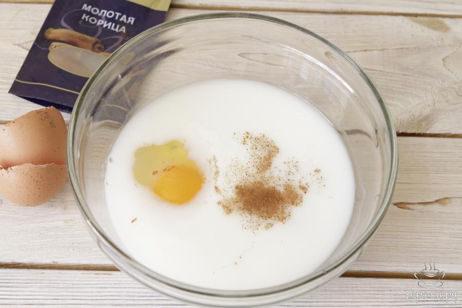 2. В чашу для замеса влить кефир комнатной температуры 1 стакан (200 мл), добавить закваску, соль, сахар, корицу и одно яйцо.