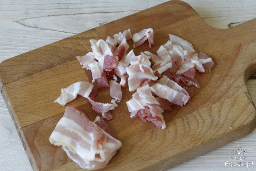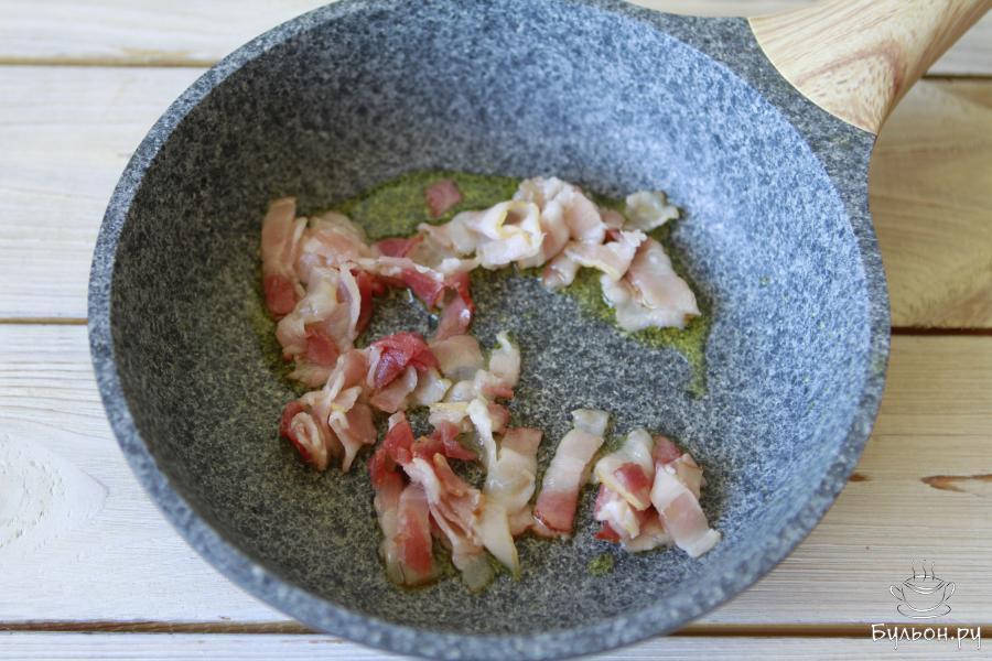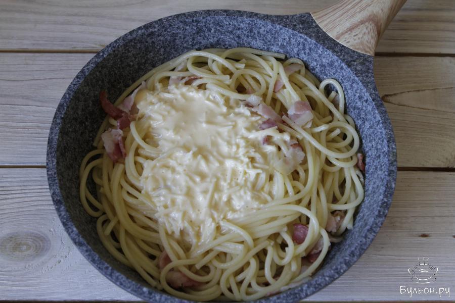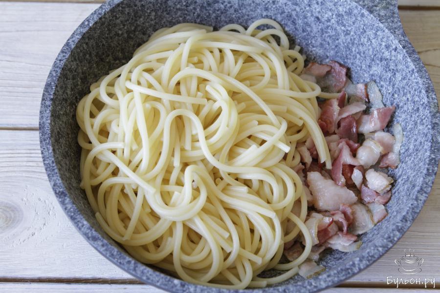 7. Отварить спагетти согласно инструкции (на 100 гр спагетти необходимо 1 литр воды). Откинуть их на дуршлаг. Спагетти выложить на сковороду к бекону.