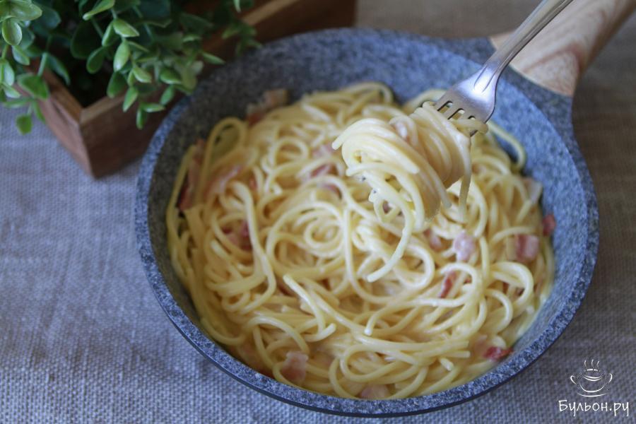 Паста Карбонара довольно популярное блюдо в Италии. Если говорить о классическом рецепте, то паста Карбонара готовится без добавления сливок. Пасту заправляют соусом из желтков и сыра. Мне нравится вариант пасты со сливками, поэтому предлагаю приготовить это блюдо по моему рецепту с добалением бекона и яйца. Из этого количества ингредиентов получается две порции. Подавать пасту необходимо сразу же после ее приготовления.