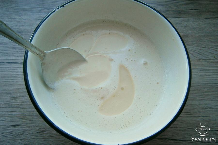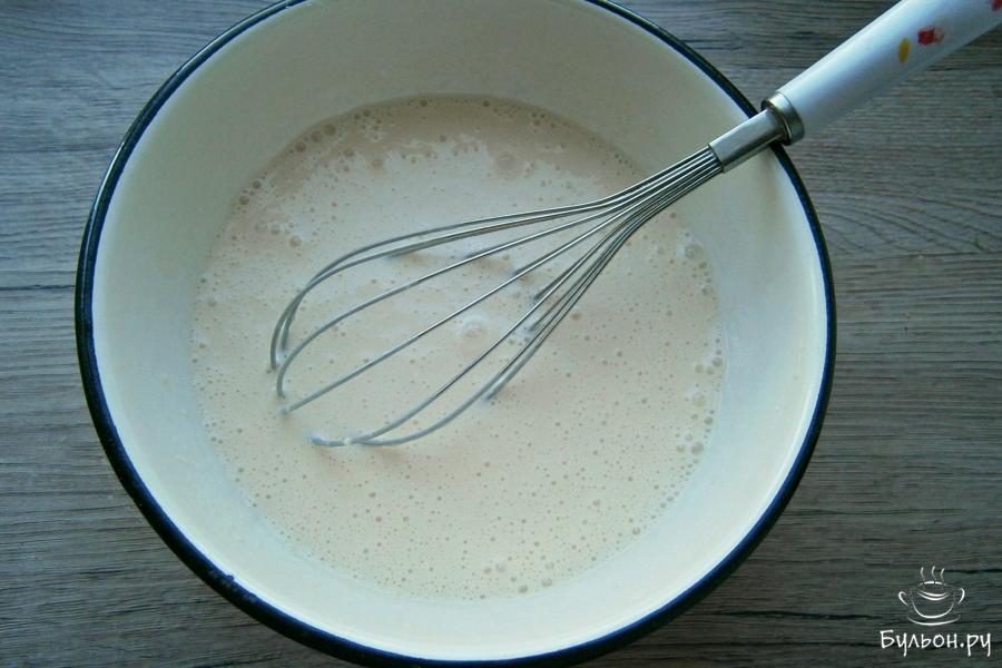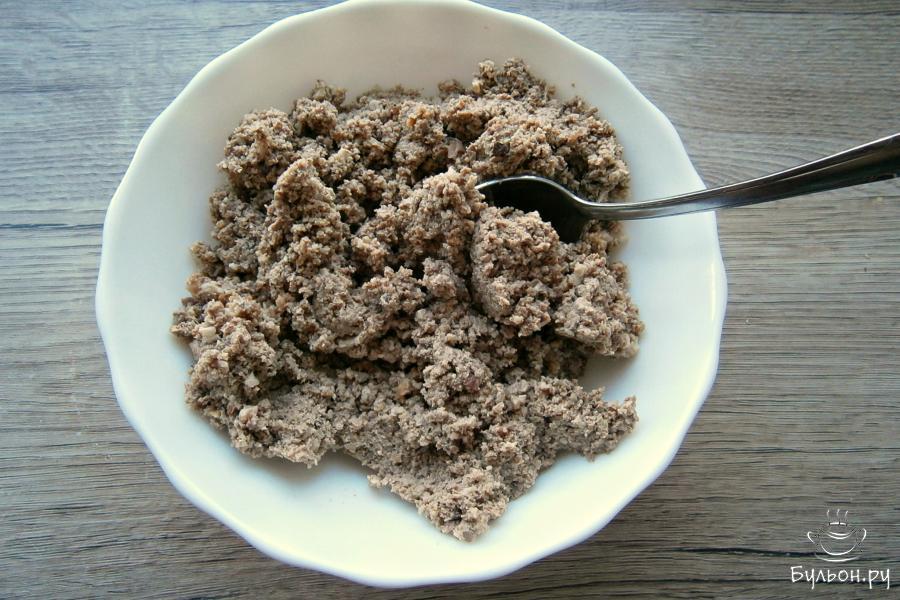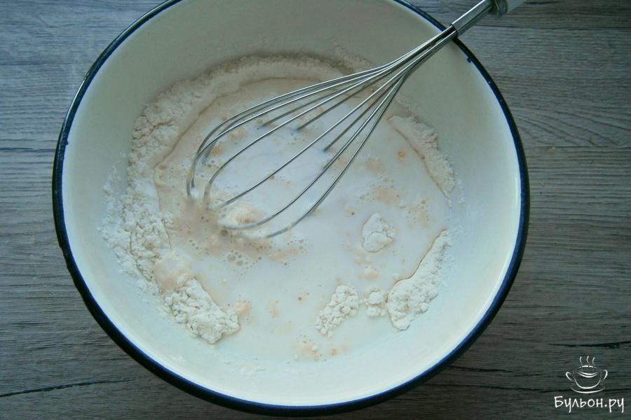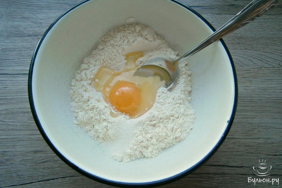 4. Начинку остудить. Для приготовления блинчиков: в муку разбить яйцо, всыпать оставшуюся соль, соду и немного сахара.