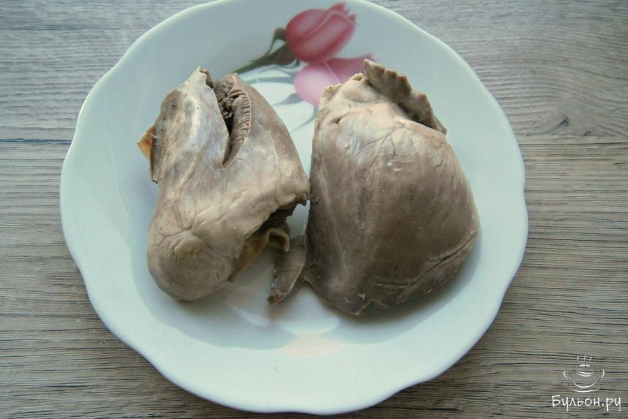 1. Сердце свиное хорошо вымыть, обрезать все ненужное, отварить его в подсоленной воде около полутора-двух часов. Готовый субпродукт остудить.
