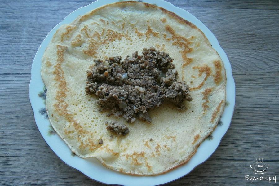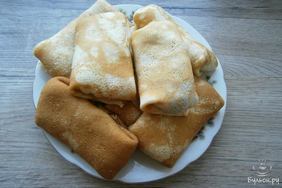 8. Блинчики пожарить обычным способом, чуть смазывая любым растительным маслом сковородку. Затем, все блинчики нафаршировать начинкой, класть ее следует по 2 ст. л.
