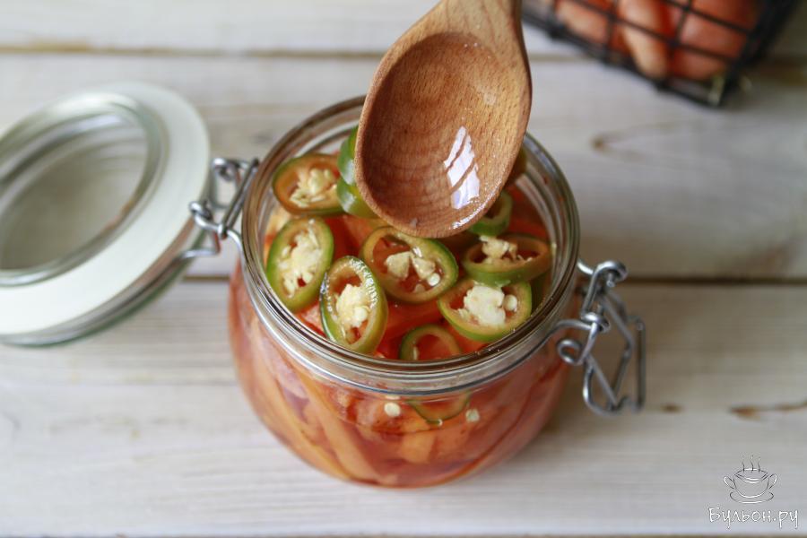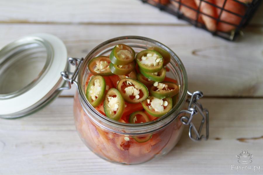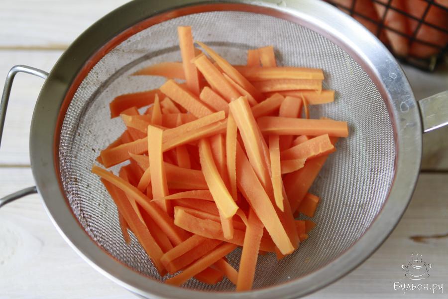 Любителям моркови хочу предложить простой и достаточно вкусный рецепт закуски из моркови с острым перцем чили. Ее можно подать на стол с разносолом, приготовить вкусный бутерброд с кусочком свежего хлеба. Или подать в качестве гарнира к мясу или рыбе. Морковь предварительно бланшируется, можно просто залить кусочки моркови кипятком на пару минут. Масло, которое разливается по банкам, обязательно нужно будет подогреть. Ну и хранить готовую закуску лучше всего в прохладном месте.