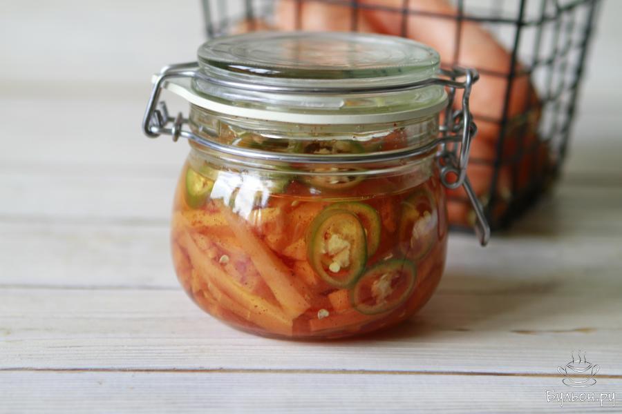 8. Банку закрыть и хорошо потрясти. Оставить на столе на 10-12 часов, а позднее убрать в холодильник. Закуска "острая морковь" готова. Приятного Вам аппетита.