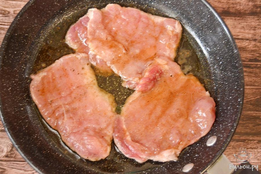 7. Отожмем стейки и выложим на разогретую сковороду, слегка политую подсолнечным маслом. Жарим с двух сторон на умеренном огне.