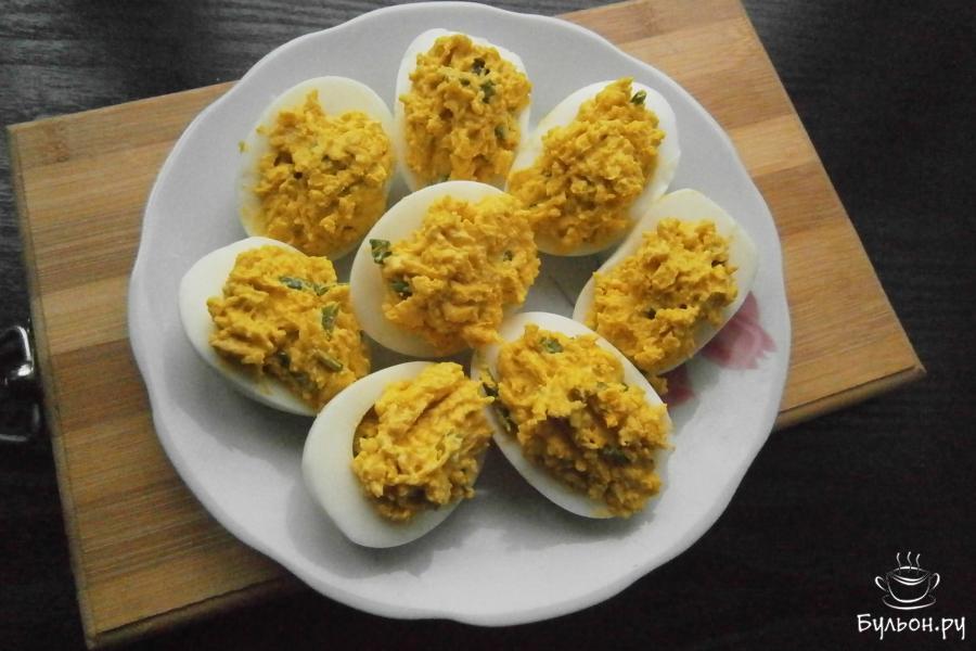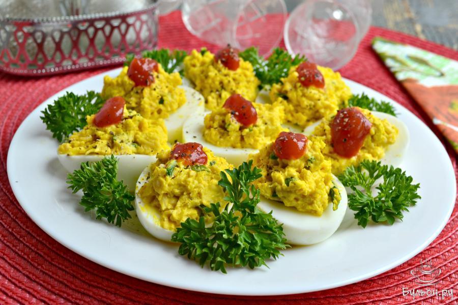 Для любого праздничного стола, предлагаю приготовить простую, но очень нарядную и вкусную закуску - фаршированные сыром яйца. Особенно ярко и празднично будет выглядеть блюдо, если вы будете использовать домашние яйца с ярким желтком. Сыр для закуски можете использовать любой - и твердый, и плавленный, и рассольный. Закуску можно также, быстро приготовить к неожиданному приходу гостей, времени это займет совсем не много. Попробуйте, все просто и необычайно вкусно.