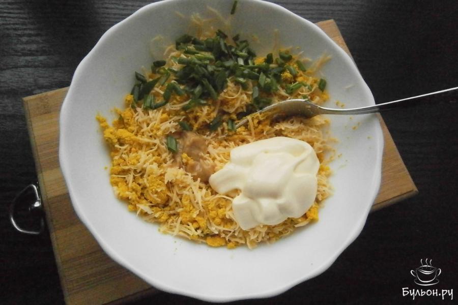 5. Сюда же, добавить ложечку горчицы, измельченную зелень лука, а также, майонез. Немного все посолить.