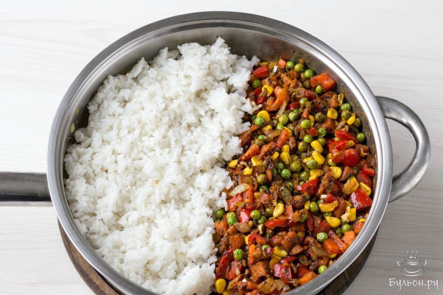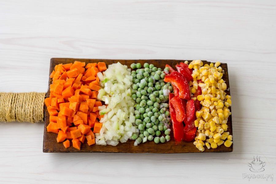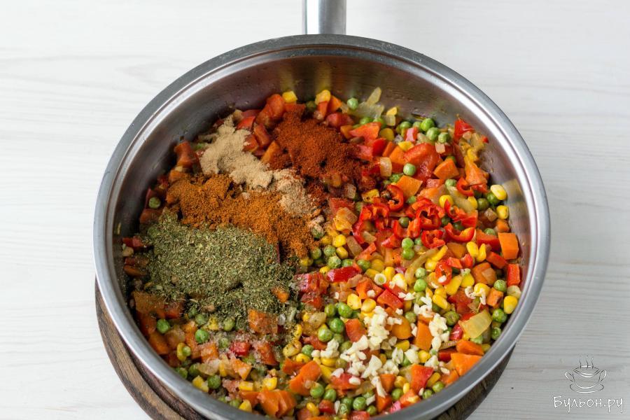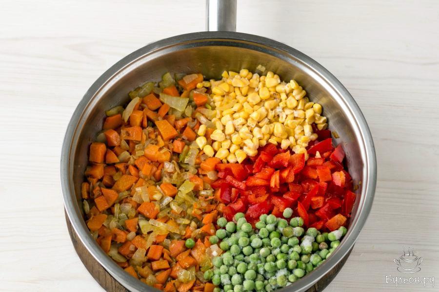 5. Добавьте сладкий перец, замороженную или свежую кукурузу и зеленый горошек. Периодически помешивая, обжарьте все несколько минут.