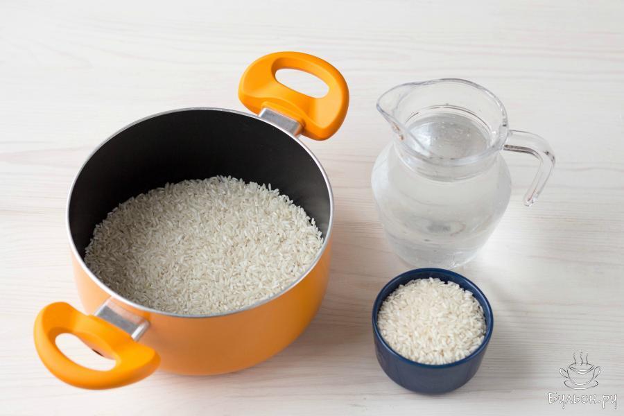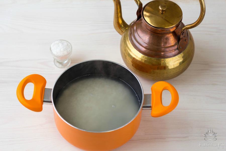 2. Залейте рис двумя стаканами кипятка и добавьте 1-2 щепотку соли. Прикройте кастрюлю крышкой и доведите воду до кипения. Затем уменьшите огонь до минимального, и варите рис 10-12 минут.