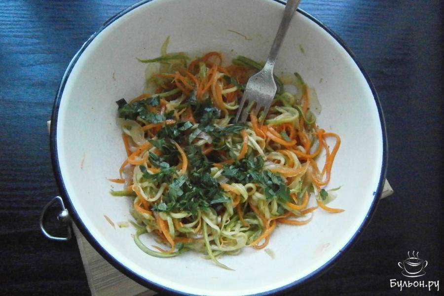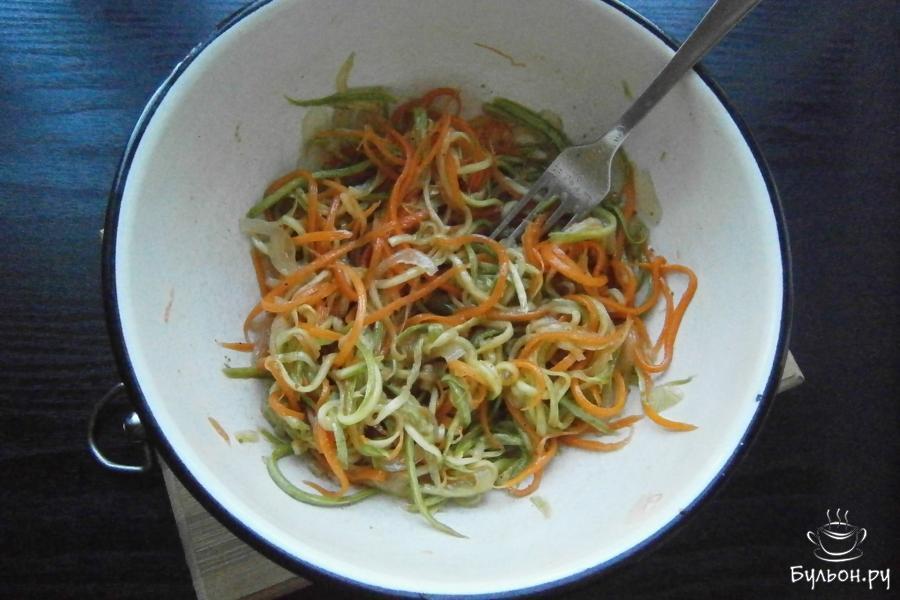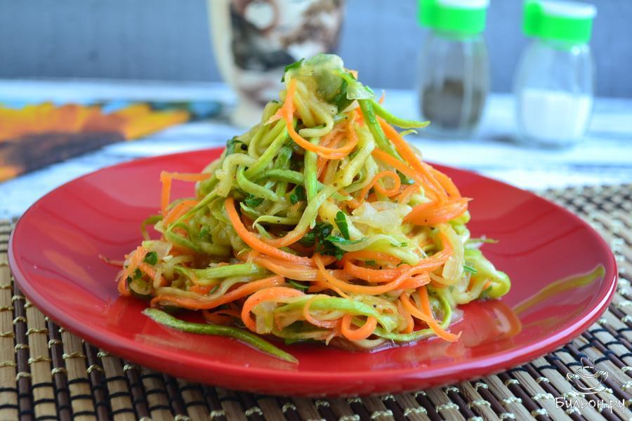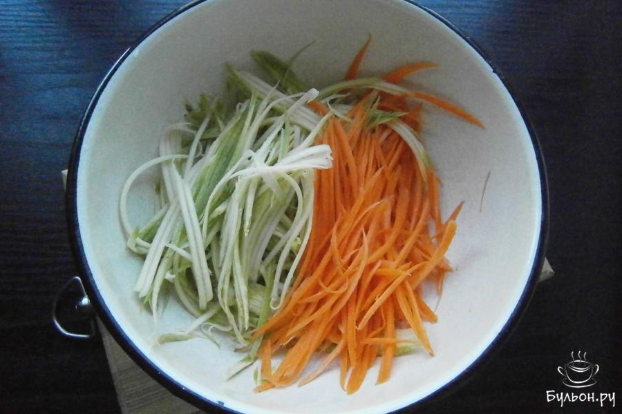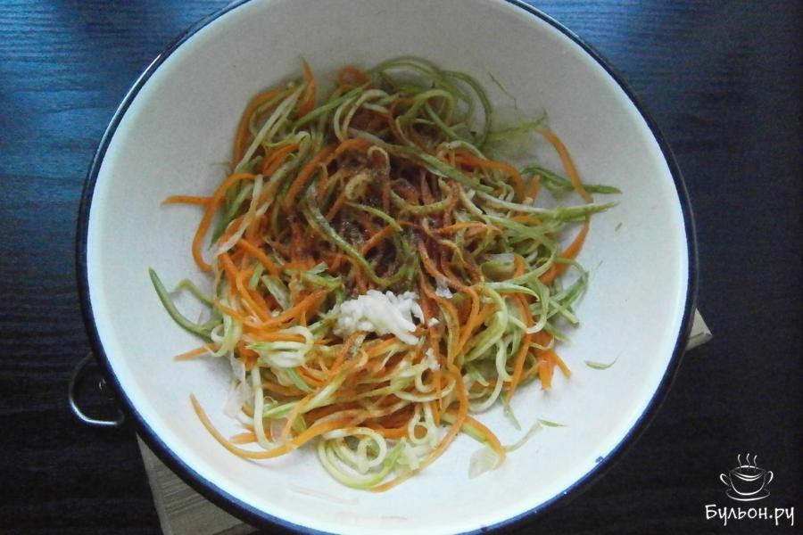 1. Кабачок и сырую очищенную морковь натереть на корейской терке. Середину кабачка с семенами не использовать.
