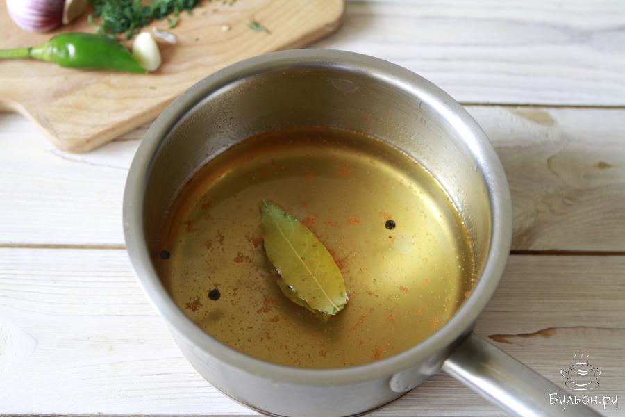 4. Подготовка маринада. Для него в сотейник влить воду, растительное масло, винный или бальзамический уксус и все специи. Маринад прокипятить на медленном огне 3-4 минуты.
