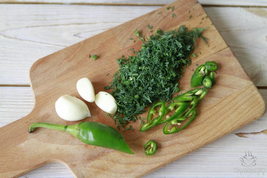 2. Как можно мельче нарезать укроп, подготовить чеснок и перец чили. Остроту закуски регулируйте самостоятельно.